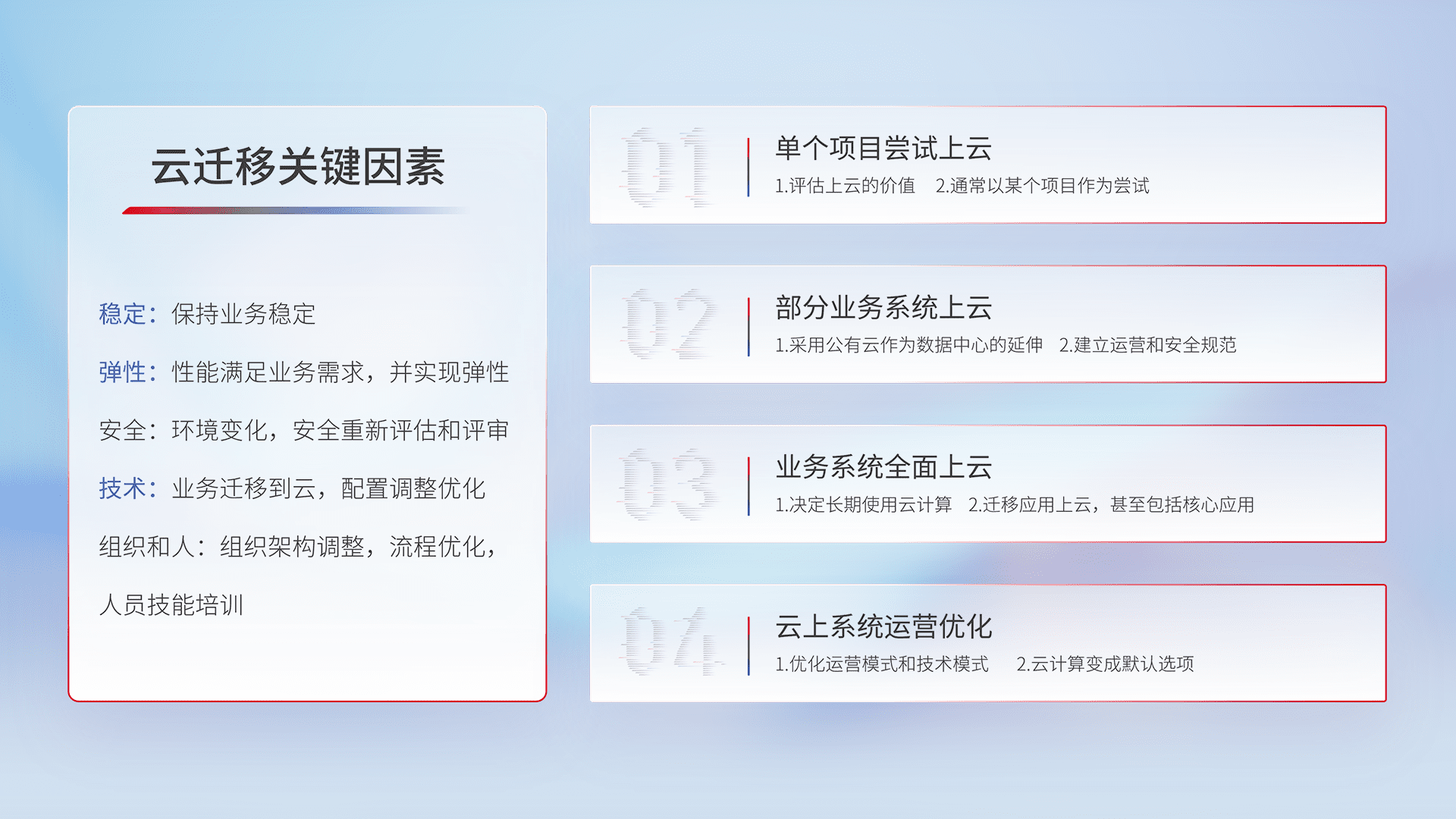 结合实际业务,,,从规划设计、、、、云平台选型、、、云原生改造、、、数据迁移、、集成交付,,,迁移全过程为客户识别最佳上云路径,,做好风险识别管理,,,设计网络架构、、、、身份权限、、、安全审计合规、、、、操作审计、、、、日志审计、、、、监控告警策略、、、、多站点容灾设计等,,对云上基础设施进行整体规划,,提升IT治理水平,,以满足弹性、、、、高可用、、、、高性能的需求。。。。