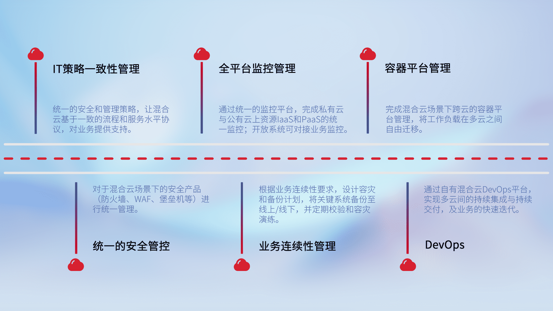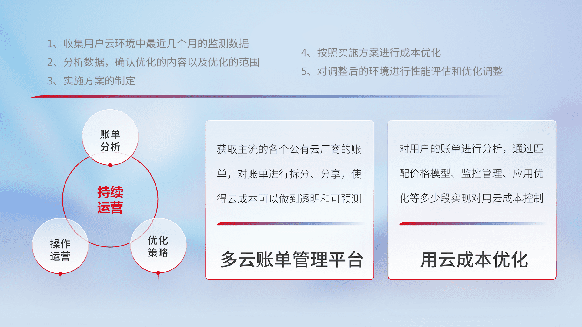通过多云纳管,,,,以统一的资源数据模型把客户的云资源进行抽象和封装,,,进而实现对多云资源的统一操作,,保障云资源管理的可靠性、、稳定性与可用性。。。量身定制化运维内容,,配置、、开发运维、、、、补丁管理、、、备份、、、监控、、、认证和访问管理、、、审计和日常巡检等,,,保障在用云过程中的可靠度,,稳定度以及高可用率。。