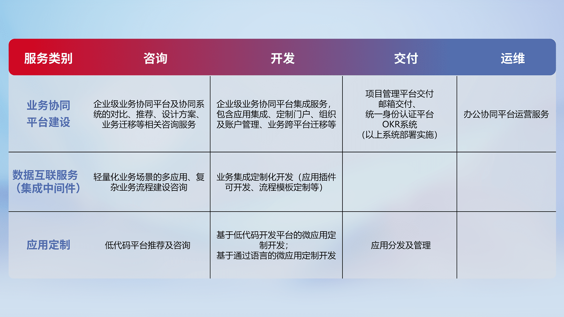针对钉钉、、、企微、、、、IDaas等平台级产品提供产品的规划、、方案、、、交付、、定制化开发等服务,,,,实现如统一协同办公、、智能客户服务、、混合会议管理、、智能数据查询、、等业务场景,,,实现数字化转型。。。。